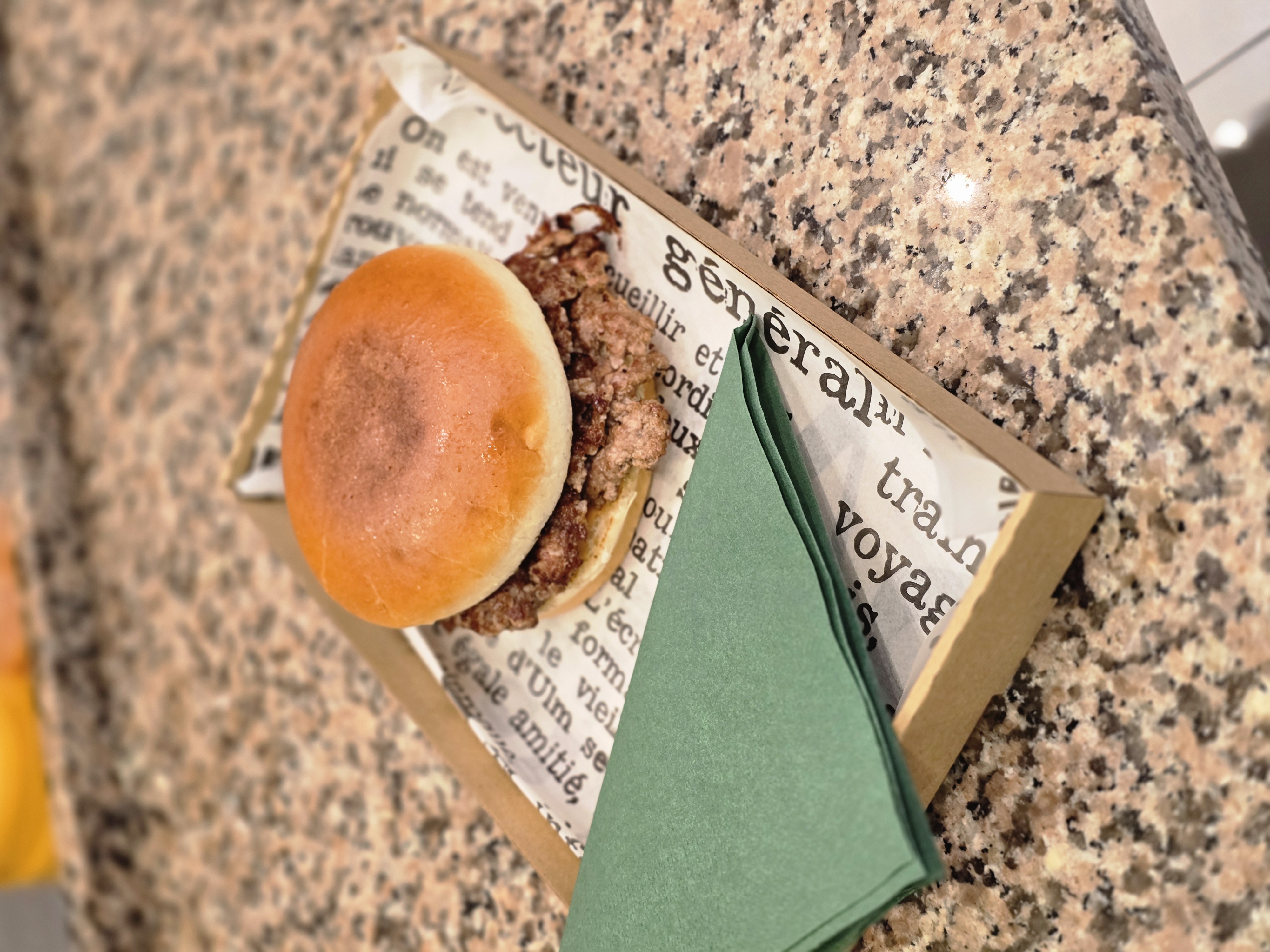 (100% MARHAHÚS,HÁZI HAMBURGER SZÓSZ,SAVANYÚ UBORKA,+(menü: kisadag sült krumpli+0,5l coca cola 750ft+50ft drs))