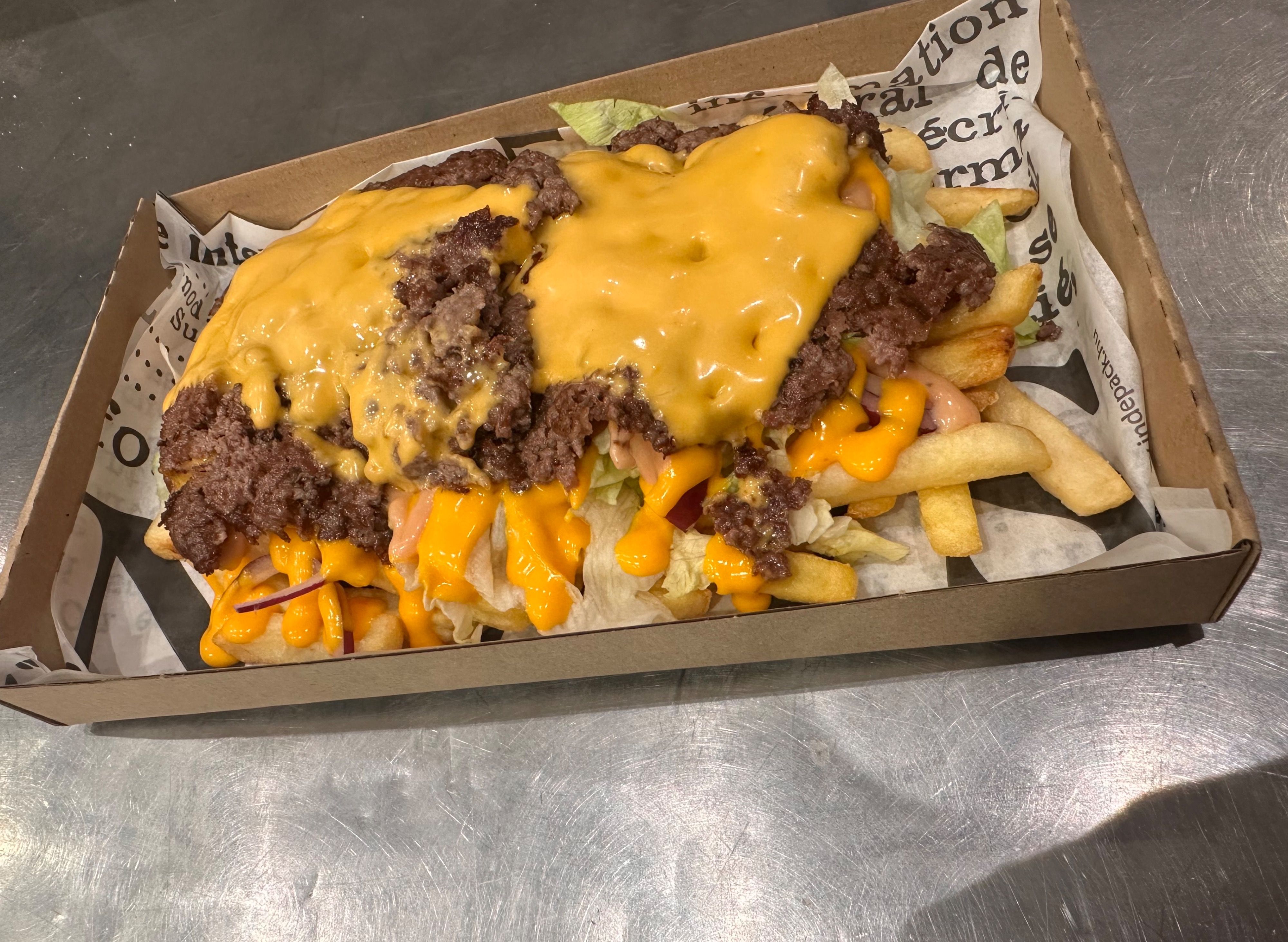 (100% MARHAHÚS,HASÁBBURGONYA,LAPKA CHEDDAR SAJT,CHEDDAR SAJT SZÓSZ,HÁZI HAMBURGER SZÓSZ,JÉGSALÁTA,LILAHAGYMA,+(menü: kisadag sült krumpli+0,5l coca cola 750ft+50ft drs))