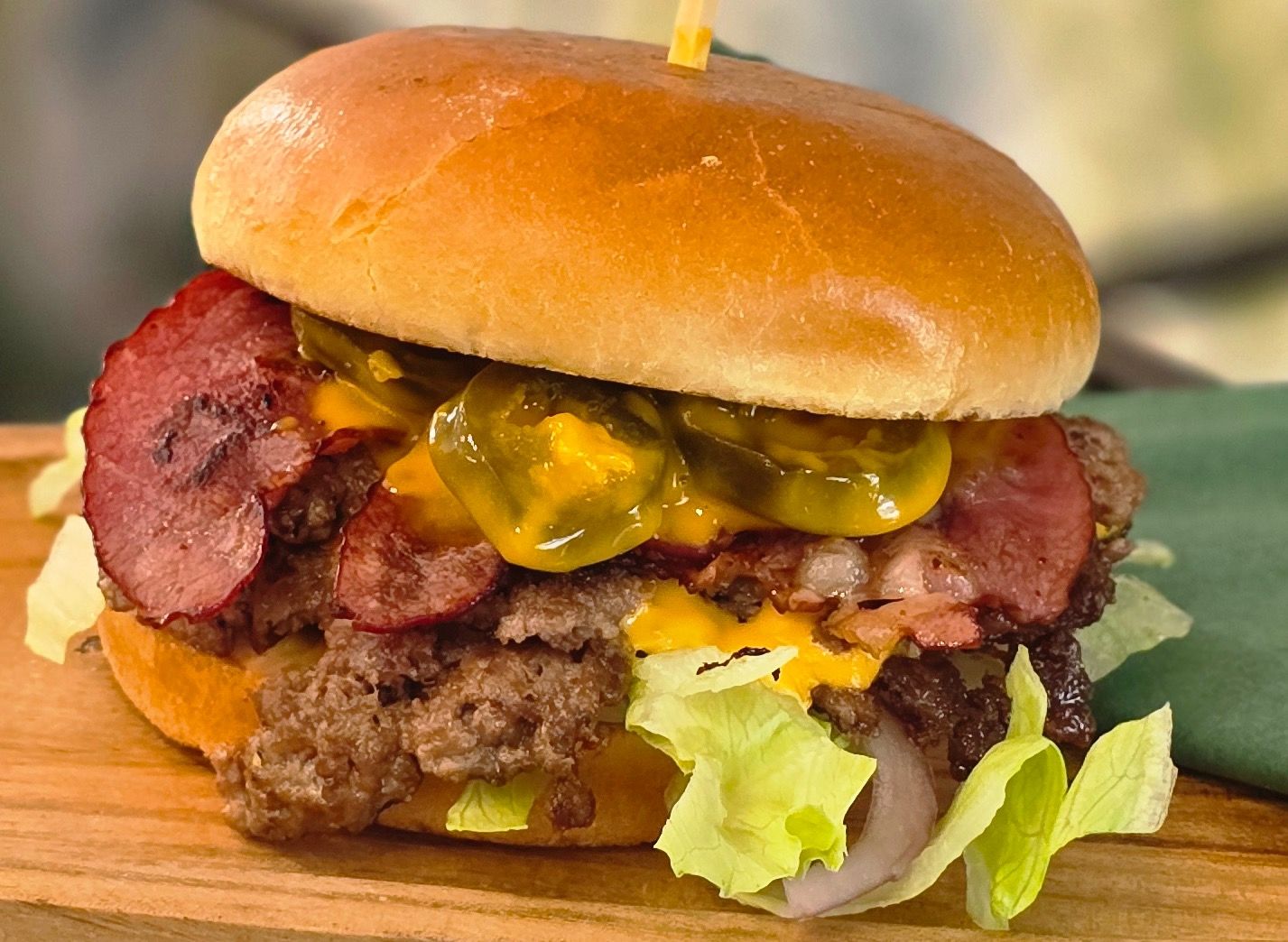 (100% MARHAHÚS,LAPKA CHEDDAR SAJT,SAVANYÚ UBORKA,HÁZI HAMBURGER SZÓSZ,TARJA,JÉGSALÁTA,LILAHAGYMA,JALAPENO,CHEDDAR SAJT SZÓSZ,+(menü: kisadag sült krumpli+0,5l coca cola 750ft+50ft drs))